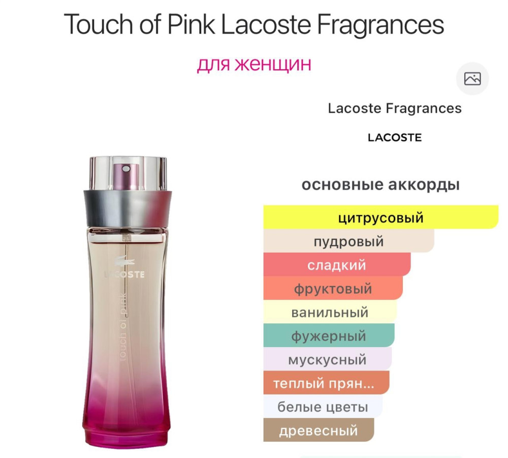 🩷🤍🩷 СНОВА В НАЛИЧИИ 🩷🤍🩷 💃🏼 Touch of Pink Lacoste Fragrances — это аромат для женщин, он принадлежит к группе цветочные фруктовые. Парфюмер: Domitille Michalon Bertier. 🌸 Верхние ноты: Апельсин, Персик, Красный апельсин, Кориандр и Кардамон; средние ноты: Жасмин, Кориандр, Кардамон, Лист фиалки и Семена моркови; базовые ноты: Ваниль, Мускус и Сандал.🍃 💐 Аромат легкий, воздушный, но при этом дерзкий и манящий. 💃🏼Идеально подходит для теплого времени года (весна-лето) и дневного использования. Аромат часто описывают как нежный, свежий и пудровый. 😍 90 ml 🩷 1100₽ 🤍 Качество Люкс ⚜️ Садовод 9-88 🛍️ ▪Для заказа пишите в ✏WhatsApp👇 wa.me/9262655010 #MAX/9262655010 🎊Подпишитесь на нашу группу t.me/stambulparfum Товар добавлен: 24.02.2026 12:40:57 Источник: vk.com/stambulparfum?w=wall568826797_6390