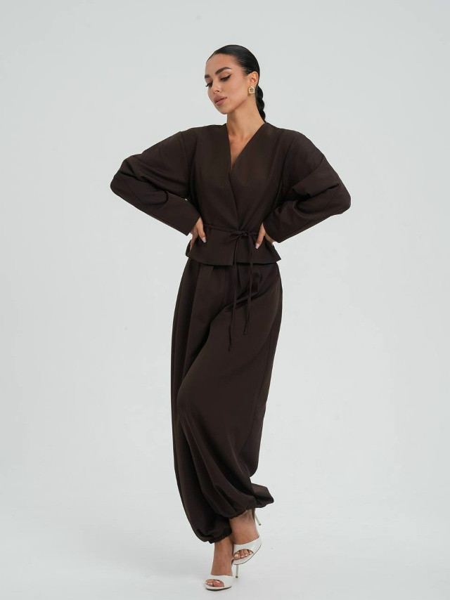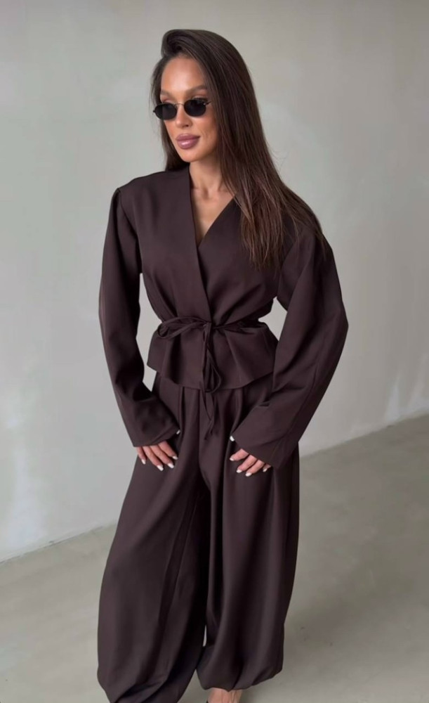 - 2800₽ Цена опт (от 4х штук): 2600₽ Костюм пиджак с поясом и брюки алладин Размеры: 42,44 В расцветках: шоколадный, черны