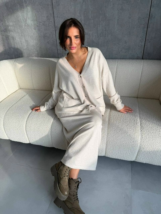 - 01201(580) Кардиган: длина - 60 см.,ПОГ-70 см. Юбка: длина-92 см.,ПОБ-50 см. ️Цвета:Молочный,кофе. ️