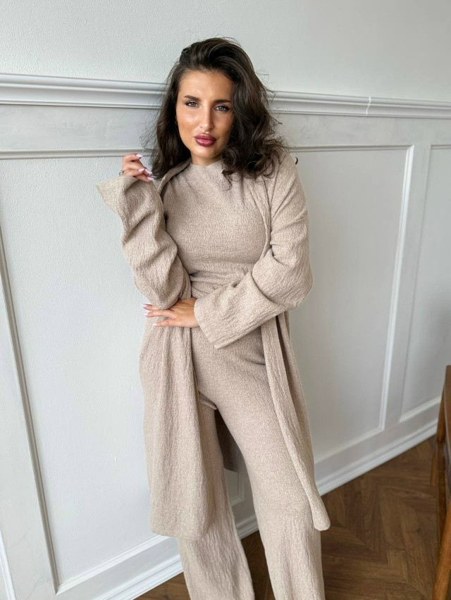 - Костюм тройка топ+кардиган+брюки Элегантный и универсальный трикотажный костюм состоящий из трех предметов с эффектной текстурой "зерно" в самых трендовых оттенках Артикул: